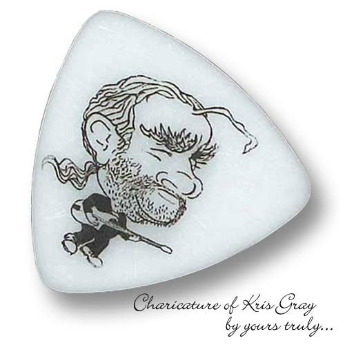 For playing bass I use the Steve Clayton heavy pick specially made for me with the caricature by the late, great Babz Bell. She was a close friend who did a lot of the CD covers featured here, sadly she died at the age of 55 from cancer, I miss her.